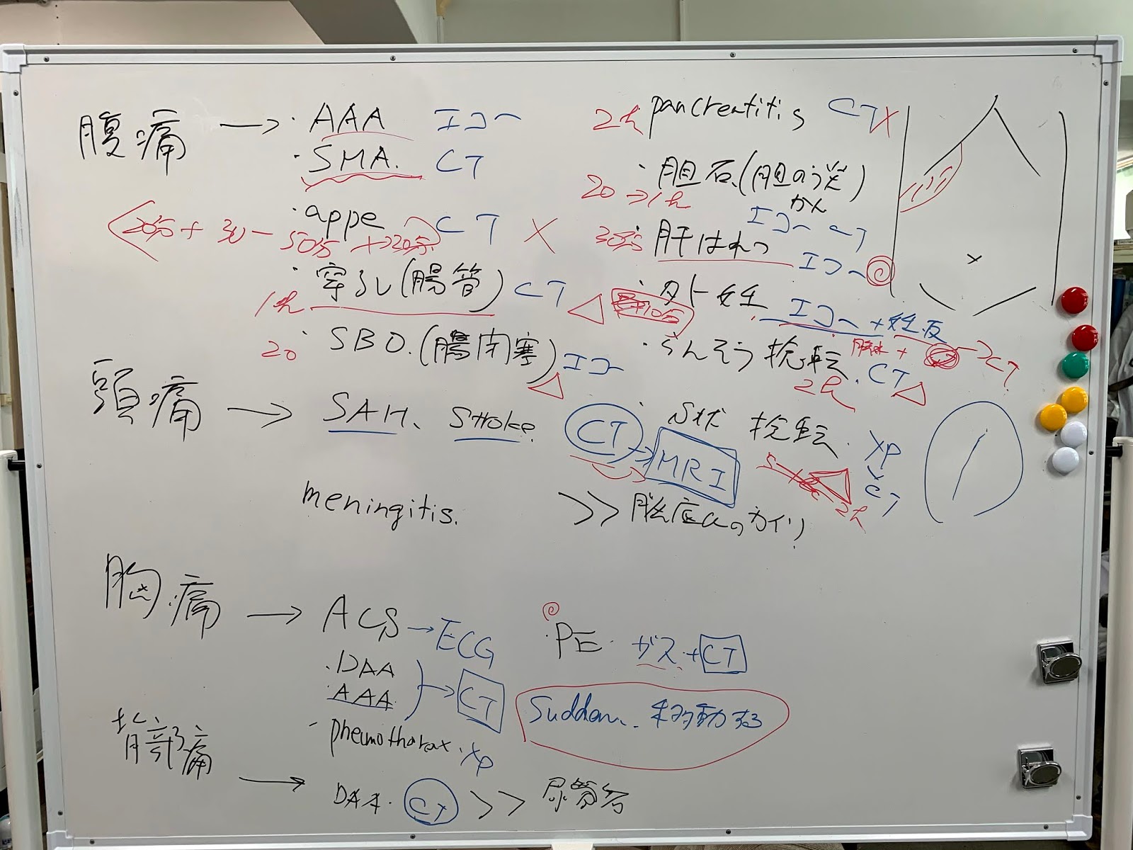 まだまだ色々ありますが、緊急性を要する主訴は、①-④+血管損傷を伴う外傷でしょう。今回は外傷は取り上げません。
