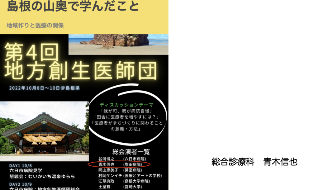 その後一週間もしないうちに、北海道のとある病院の見学に弾丸1泊2日で向かい、そのホテルで千葉大学のオンライン講座に参加。羽田に戻って空港滞在1時間ちょっとで島根に。島根では、本当にたくさんの出会いと物事を考える新たな視点、視野の拡がりを得ることができました。「地方創生」というワードに対して今まではふわっとしたイメージしか持っていませんでしたが、意識を持ってとり組まれている方々と出会い、お話をさせていただく中で、輪郭がはっきりと見えてきました。そして、自分が行っていることもいわゆる「地方創生」の一部にあたることも再認識しました。