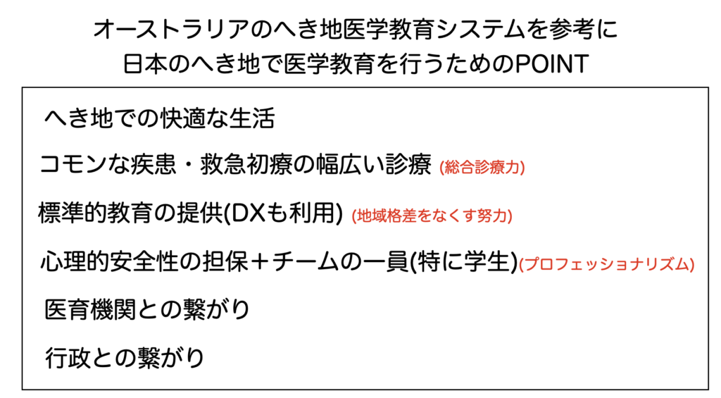 オーストラリアのへき地での医学教育システムを、日本のへき地での医学教育にフィットするように活かす」